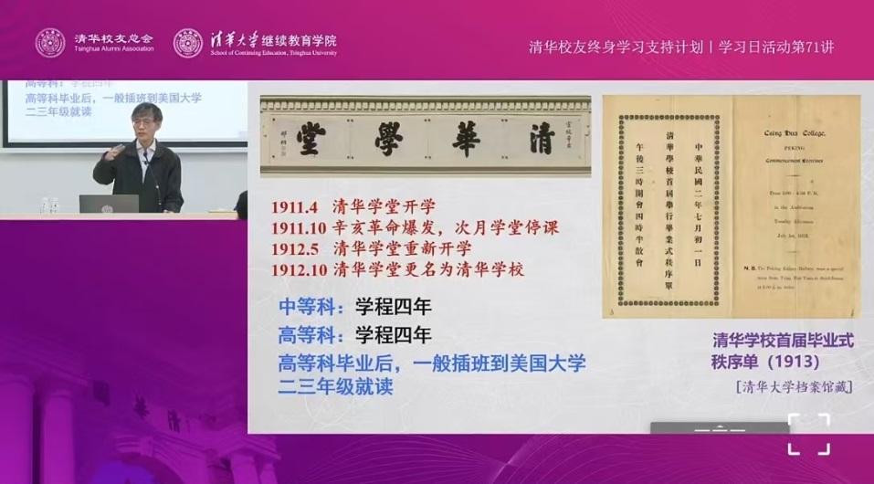 3月28日,在清华大学115周年校庆即将到来之际,清华大学校史研究室原主任、校史馆和档案馆原馆长范宝龙研究员应邀为校友总会主办的“清华校友学习日”第71场活动,主讲“珍贵档案中的清华校史”专题讲座。千余名校友及在校师生等线上线下听取讲座,同上一堂生动的校史课。