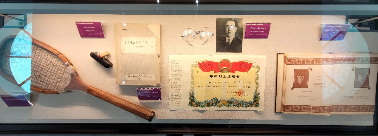 ──张甲洲烈士佩戴过的眼镜及照片、烈士证明书(张红旗、张红兵、白朔羽捐赠),20世纪40年代金石考古学家马衡手刻马咸名章(马重芳、马庆芳捐赠),王堃藩珍存的1929届清华毕业纪念册(王仁铎捐赠),侵华日军遗留在清华园的网球拍(孙建国捐赠);
