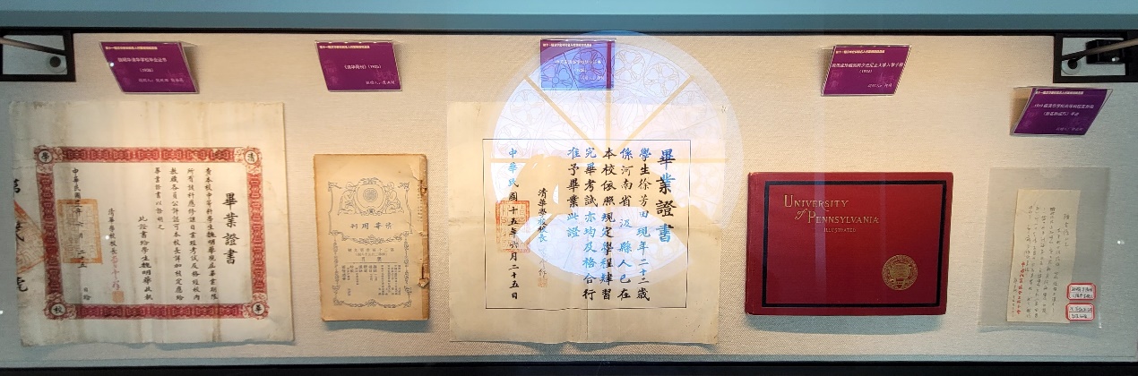 ──梁思成珍存的宾夕法尼亚大学入学手册(柯伟捐赠),清华早期共产党地下党员魏明华在1924年获得的清华学校中等科毕业证书(魏砚田、魏若愚捐赠),1919级清华学校高等科校友、中国早期电影导演、编剧孙瑜手迹(钟永新捐赠),徐芳田1926年清华学校毕业证书(徐梅捐赠),1925年《清华周刊》(詹洪阁捐赠);