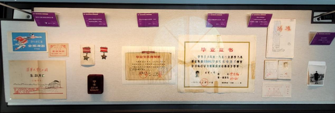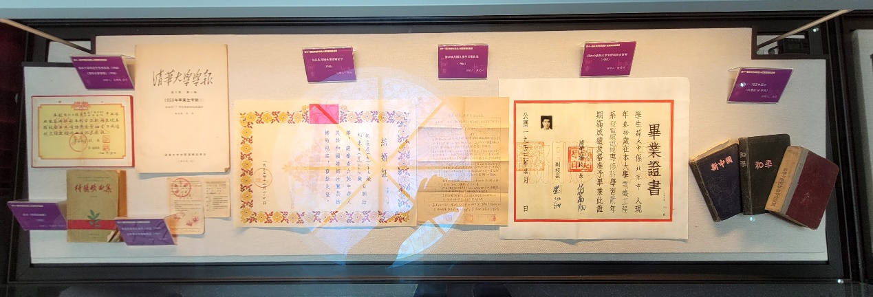 ──地球环境科学家刘东生与胡长康的结婚证书(刘强捐赠),20世纪50年代的清华幼儿园儿童生活报告表(耿忆轩捐赠)、学生膳团入伙证、火车票半价优惠凭证(刘志湘捐赠)、毕业生优良奖状、《清华大学学报》(莫佛根、贡华捐赠);